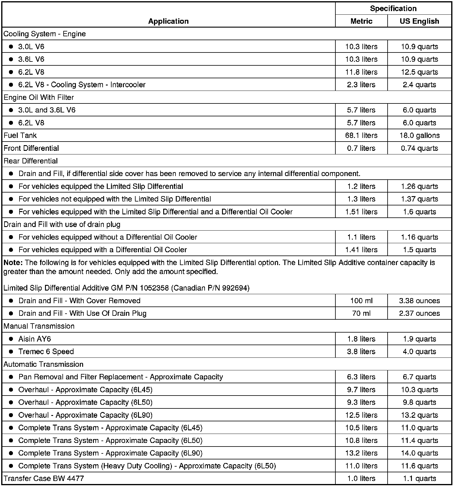 The following approximate capacities are given in US English and metric conversions. See Fluid and Lubricant Recommendations (Maintenance) for more information. All capacities are approximate. When adding, be sure to fill to the approximate level, as recommended in this manual. Recheck fluid level after filling.
