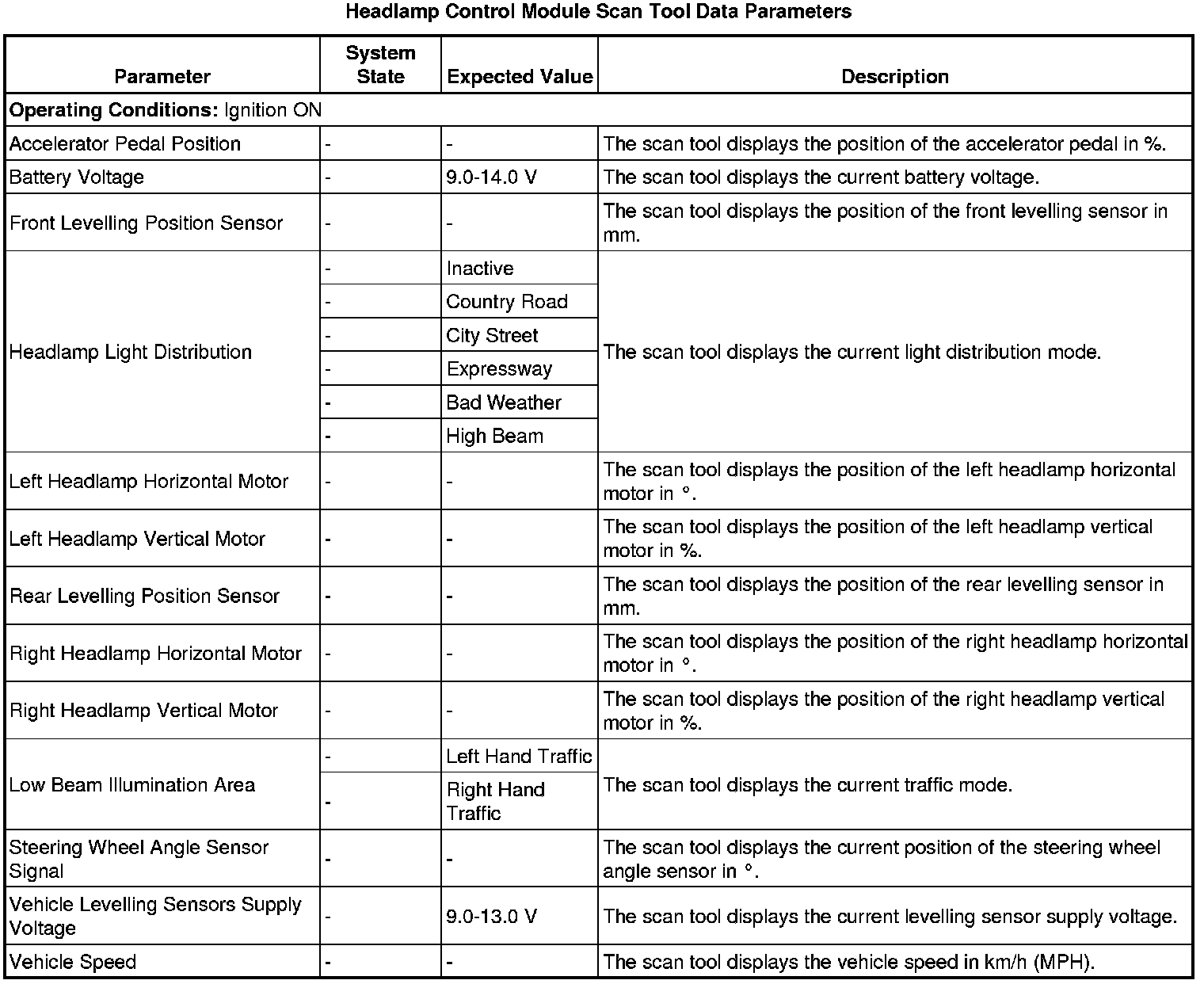 The headlamp control module scan tool data parameters list contains all headlamp related parameters that are available on the scan tool. The list is arranged in alphabetical order. A given parameter may appear in any one of the data lists.