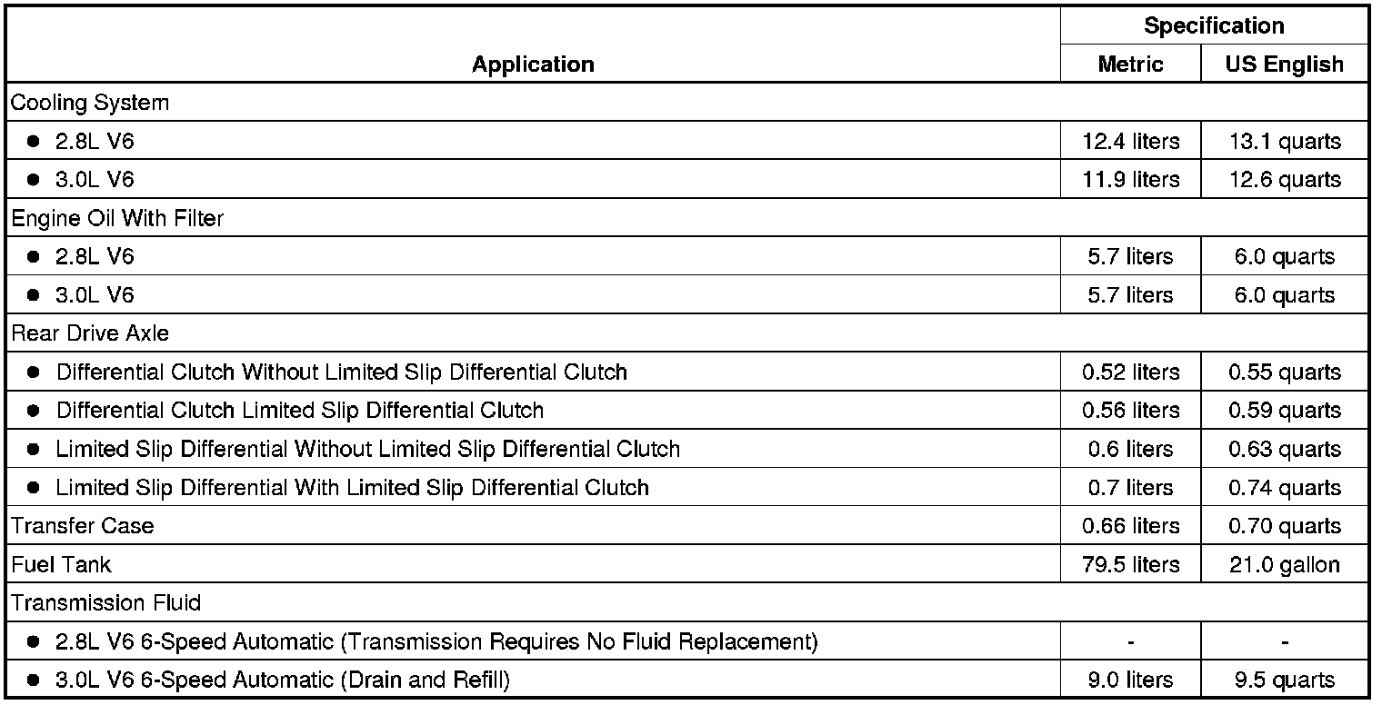 The following approximate capacities are given in US English and metric conversions. See Fluid and Lubricant Recommendations (Maintenance) for more information. All capacities are approximate. When adding, be sure to fill to the approximate level, as recommended in this manual. Recheck fluid level after filling.
