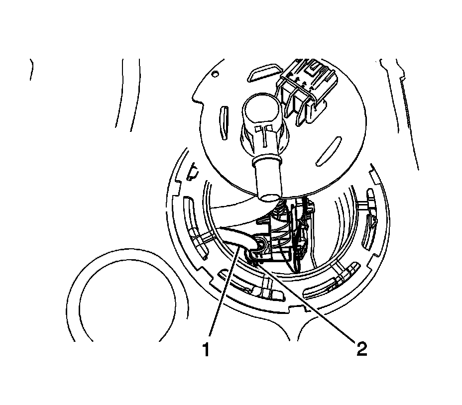 5. Partially raise the secondary fuel pump module and disconnect the crossover tube (1) by pulling back the plastic retaining tab (2).