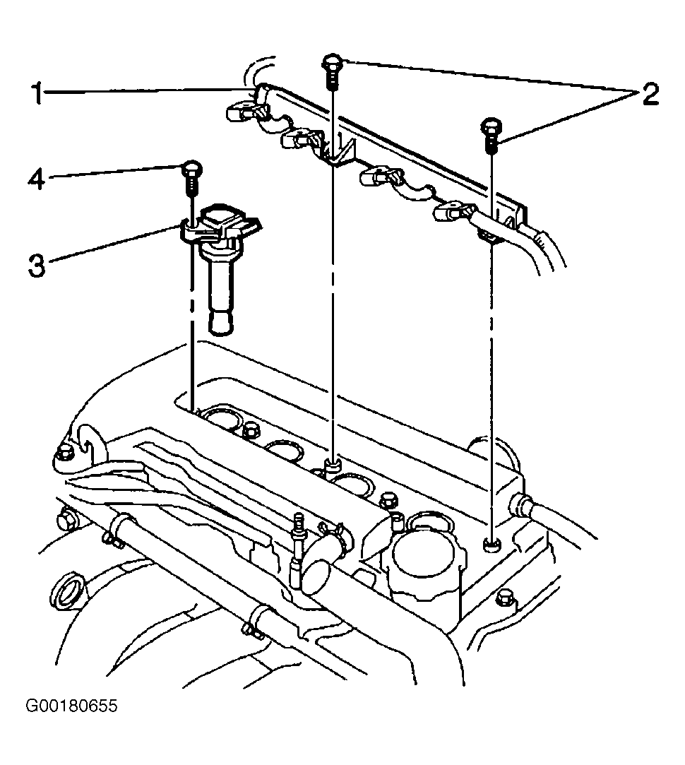 4. Remove the bolt (4) securing each ignition coil to the cylinder head cover. See Figure .