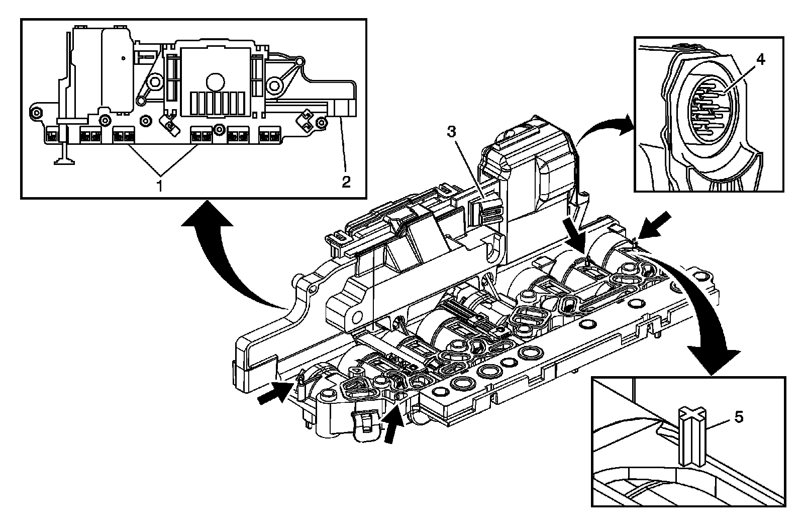 4. Inspect the 4 control solenoid (w/body and TCM) valve assembly filter plate retaining tabs (5) for cracks and ensure proper tension when filter plate is attached.