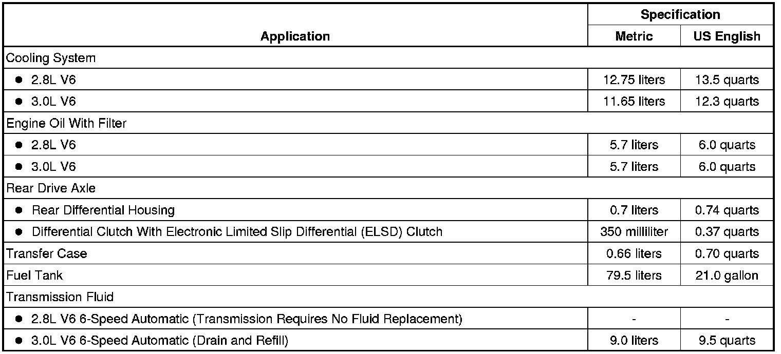 The following approximate capacities are given in US English and metric conversions. See Fluid and Lubricant Recommendations Specifications for more information. All capacities are approximate. When adding, be sure to fill to the approximate level, as recommended in this manual. Recheck fluid level after filling.
