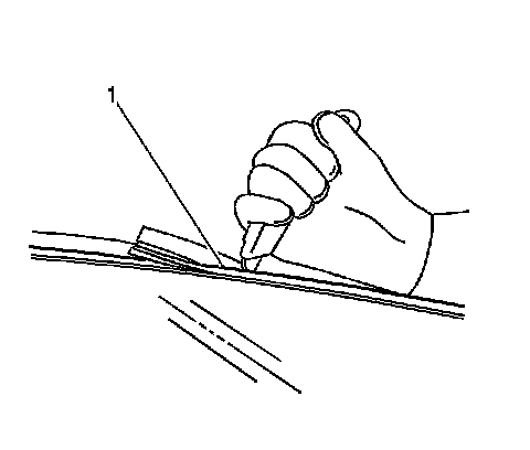 7. Using a utility knife, carefully cut the lace (1) from the sides and the top edge of the window to access the urethane adhesive bead, if equipped.