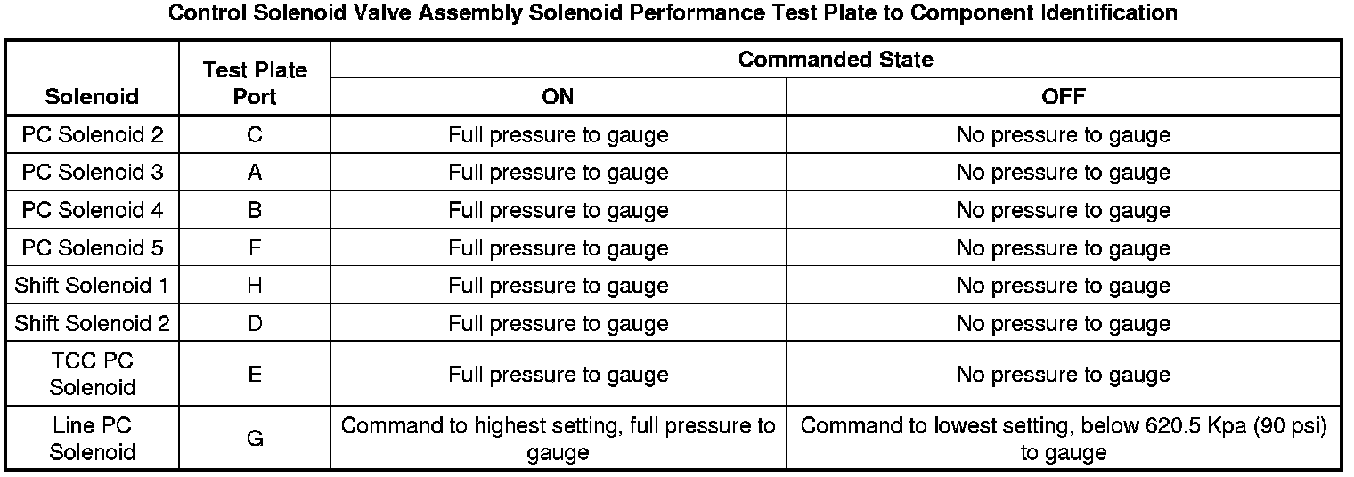 A pressure gauge is used to measure the pressurized air through the solenoid control ports. When a solenoid is commanded ON with the scan tool, pressurized air flows through the solenoid control port and displays on the pressure gauge. When the solenoid is commanded OFF with the scan tool, there is no pressurized air flow through the solenoid control port to the pressure gauge. The recommended shop air pressure for this test is 620.5-690.4 Kpa (90-100 psi).