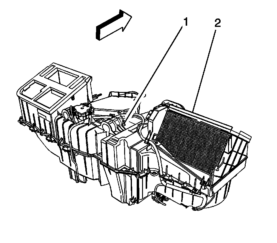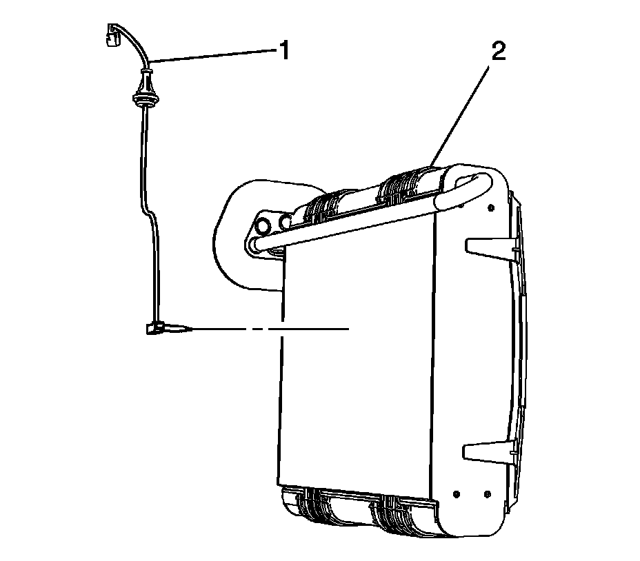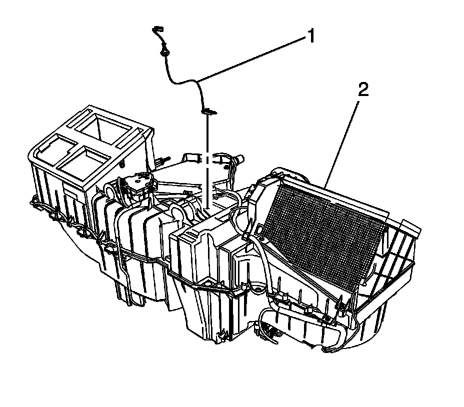 14. If the air conditioning refrigerant temperature sensor (1) is not secured to the evaporator core (2), use a pair of long needle nose pliers to grip the air conditioning refrigerant temperature sensor at the plastic base, and insert air conditioning refrigerant temperature sensor into the evaporator core.
