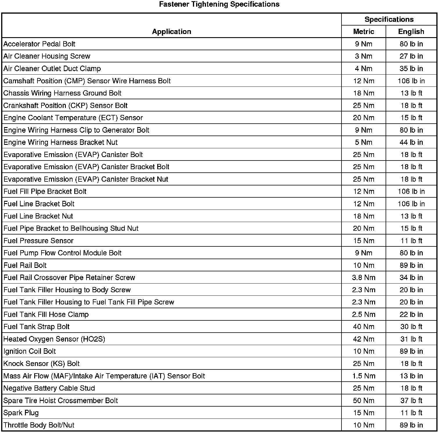 Fastener Tightening Specifications