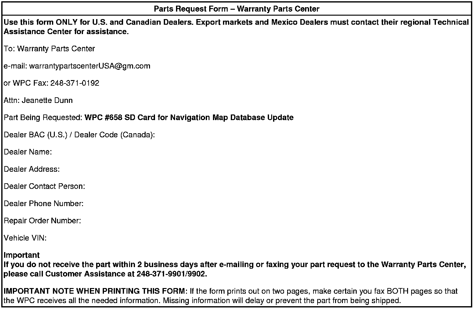 IMPORTANT NOTE WHEN PRINTING THIS FORM: If the form prints out on two pages, make certain you fax BOTH pages so that the WPC receives all the needed information. Missing information will delay or prevent the part from being shipped.