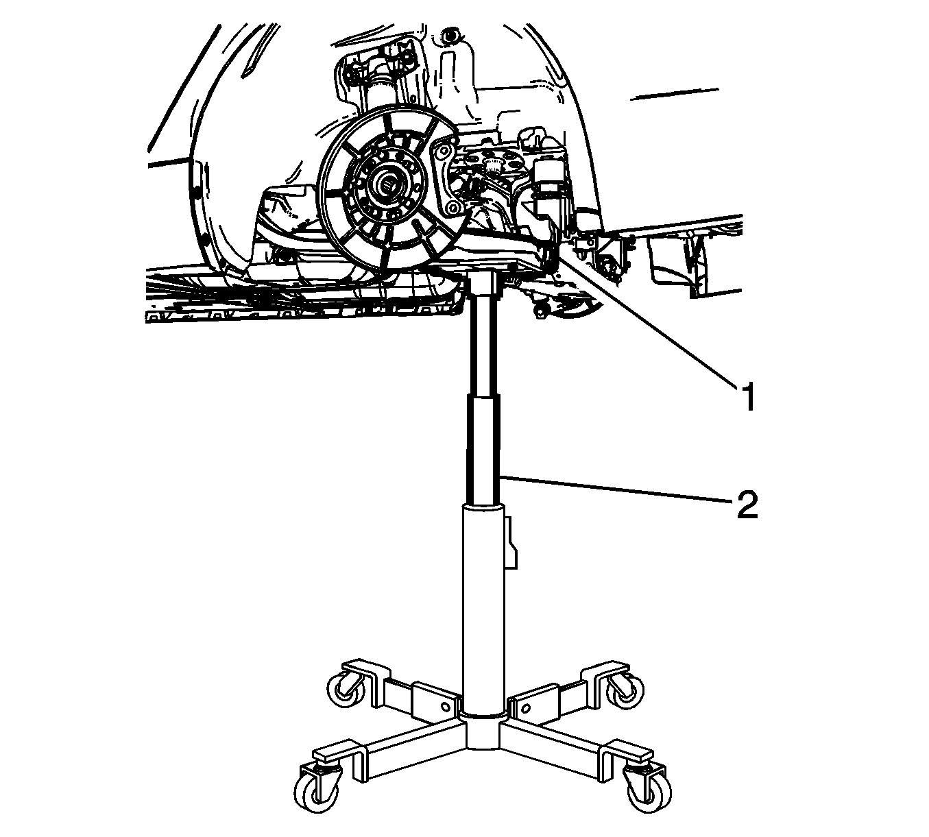 9.Support the lower control arm (1) with a suitable jack stand (2).