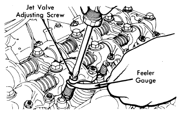 - Back off jet valve adjusting screw (counterclockwise) and place 0.006" (0.15 mm) feeler gauge between top end of jet valve stem and bottom end of adjusting screw. See Fig 2.