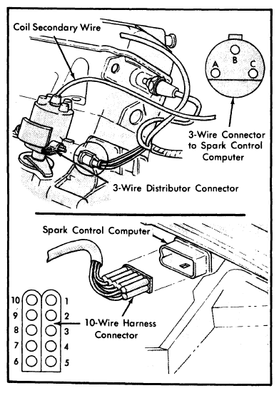 9. Reconnect 10 pin connector to computer. Hold coil secondary wire 1/4" from ground and turn ignition "ON". Use jumper wire to momentarily touch pins "A" and "C" together and check the following: