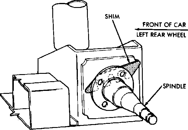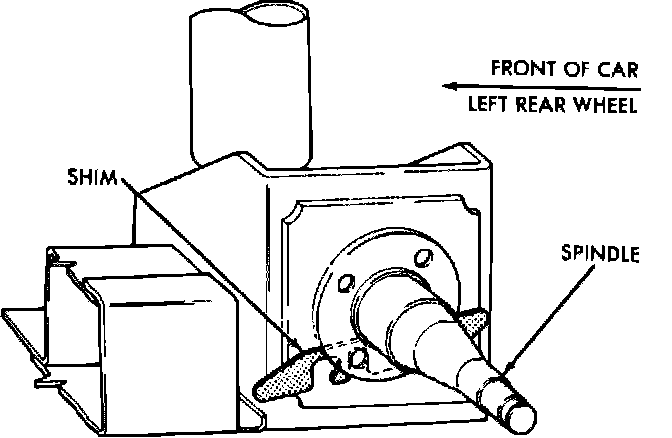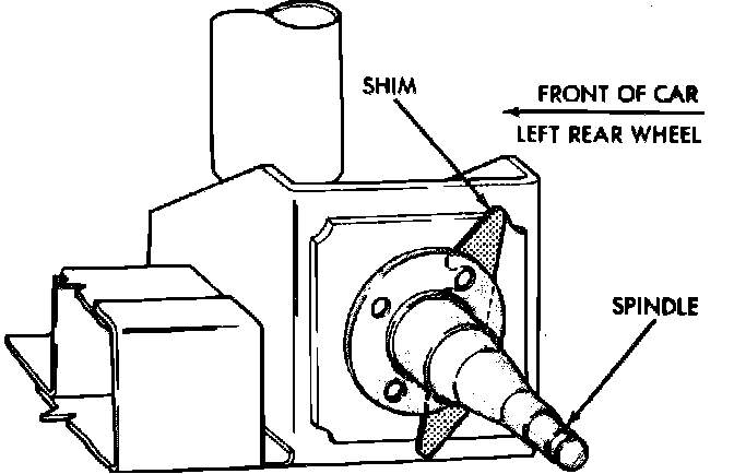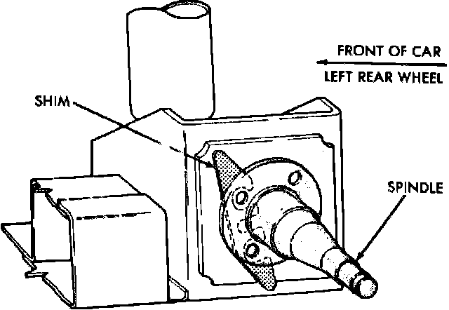 Due to the design of the rear suspension and the incorporation of stub axles or wheel spindles, it is possible to adjust the camber and toe of the rear wheels on these vehicles. Adjustment is controlled by adding shims approximately 0.010 inch thick between the spindle mounting surface and spindle mounting plate. The amount of adjustment is approximately 0° 18' per shim.