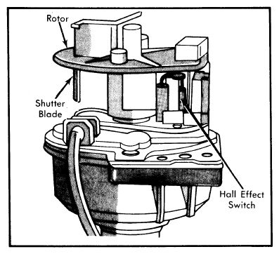 11. If spark resulted, but engine will not start, replace Hall Effect Pick-Up. Before replacing, however, always be sure rotor shutterblades are grounded. Connect 1 ohmmeter lead to a good ground and touch other lead to shutterblade. See Figure. If no continuity, push down on rotor to seat against shaft. If still no continuity, replace rotor. If shutterblade is grounded, then proceed to replace Hall Effect Pick-Up.