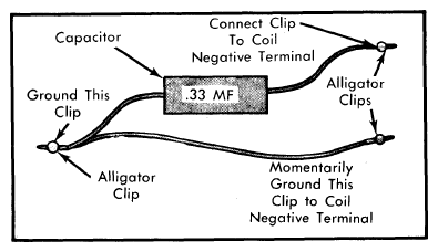 2. Remove coil secondary wire from distributor cap and hold 1/4" from a good ground. Prepare a special jumper wire assembly as shown in Fig 1. With ignition switch on, momentarily touch special jumper wire to ground and coil negative terminal. A spark should be obtained at secondary wire.