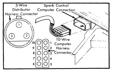 3. If spark was obtained, proceed to step  6). If no spark resulted, turn ignition off and disconnect 10-wire harness connector from computer. See Fig 2. Turn ignition back on and again, using special jumper wire, connect negative terminal momentarily to ground. Spark should be obtained.