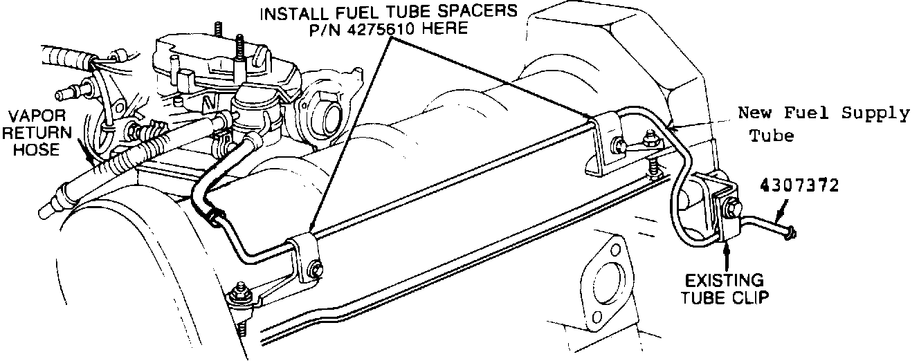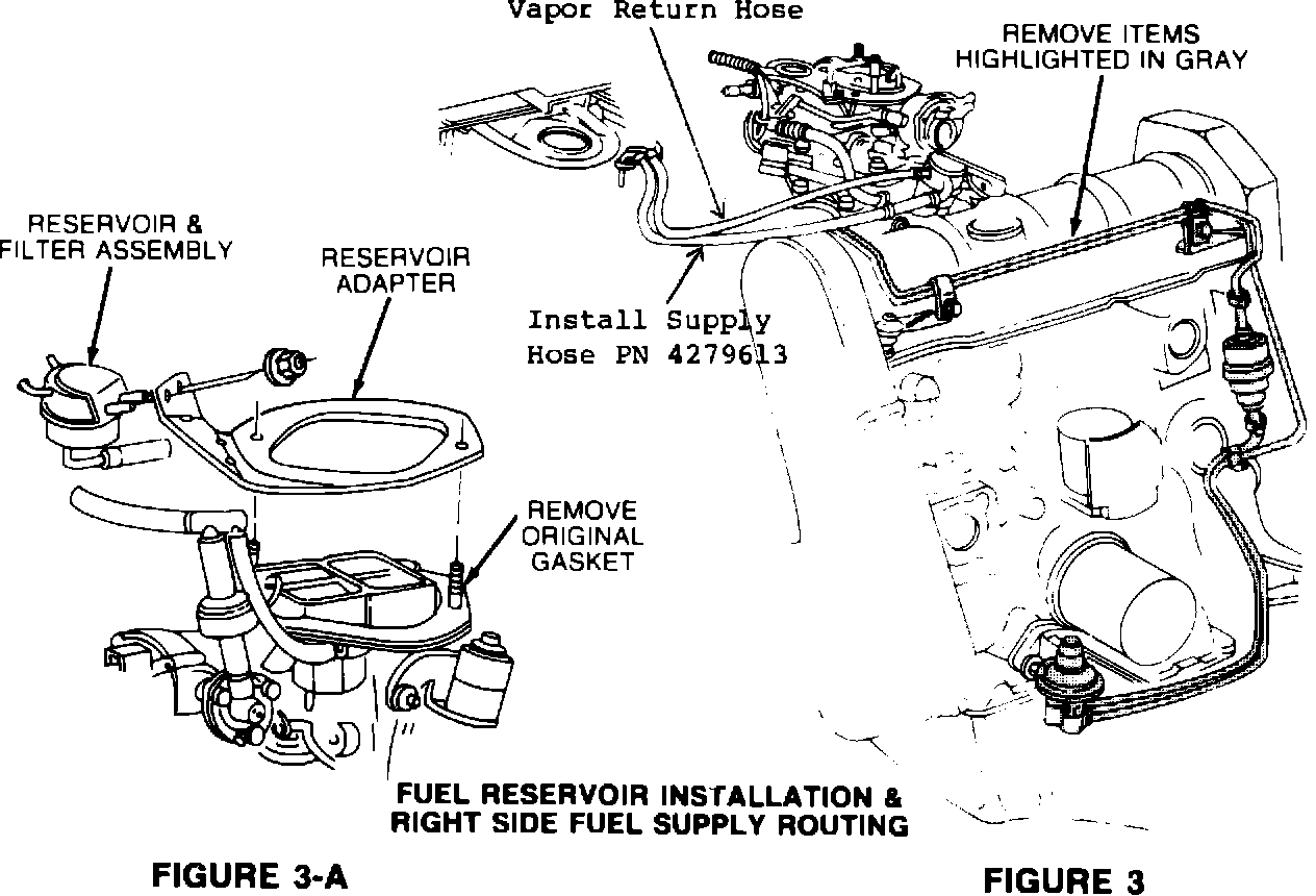 NOTE: IF VEHICLE IS EQUIPPED WITH A FUEL RESERVOIR, OR A FUEL PRESSURE REGULATOR (LATE 1987 MODELS), IT MUST BE REMOVED AND REPLACED WITH FUEL RESERVOIR/FILTER, PN 4306286, SUPPLIED.