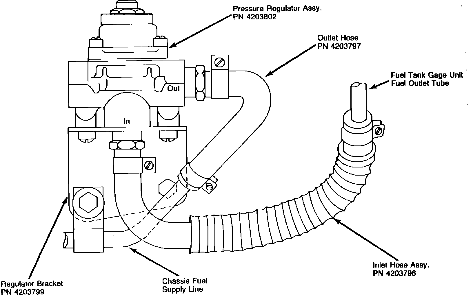 9. Remove the 3/16" vapor vent hose from the chassis vapor tube and slide the convoluted protective sleeve, PN 4203804, over the vapor vent hose. Reinstall the hose to the chassis vapor tube. Install fuel hose, PN 4203798, between the fuel tank and pressure regulator inlet (Figure 7). Install fuel hose, PN 4203797, between the pressure regulator outlet and chassis fuel line. Remove and discard the existing fuel return hose from the chassis tube, and install new fuel return hose, PN 4203557, between the chassis tube and pump/gauge unit tube. Secure all the hoses with the clamps provided. Inspect all hoses to make sure they are clamped properly and in the proper position as shown in Figure 7.