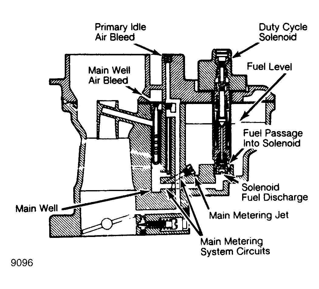 When the solenoid is de-energized by the computer, the solenoid valve spring pushes upward through main system fuel valve. When de-energized, the solenoid main metering orifice is fully uncovered, providing the richest mixture for any given air flow.