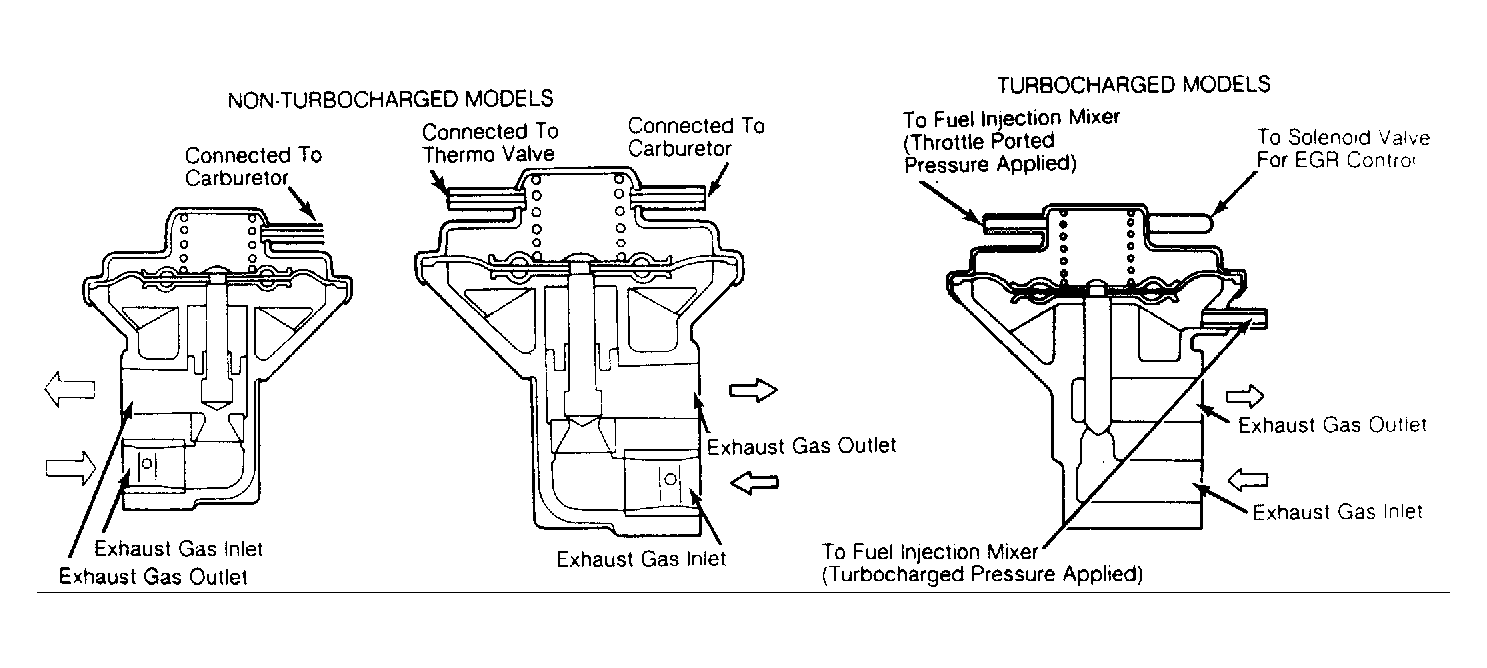 The EGR control valve compensates for the EGR system's effect on driveability. The EGR system increases EGR flow during high load operation and decreases during low load operation. There is no EGR operation at idle or wide open throttle. Three types of EGR valves are used. See Fig 1 .