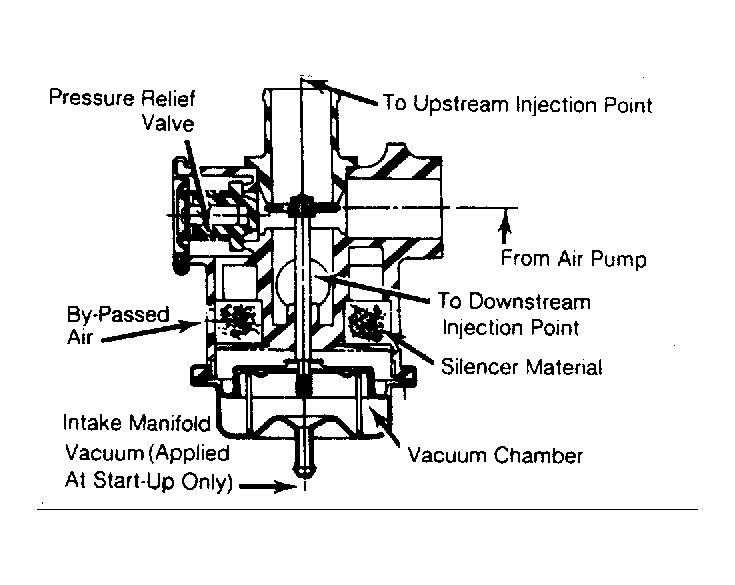 Valve also regulates by controlling output of air pump at high speeds. Valve is controlled by manifold vacuum and with either a CVSCO valve and/or a vacuum solenoid. A bleed orifice in solenoid allows vacuum signal to go to zero. Without vacuum signal, most air supply is diverted to atmosphere. See Fig 1 .