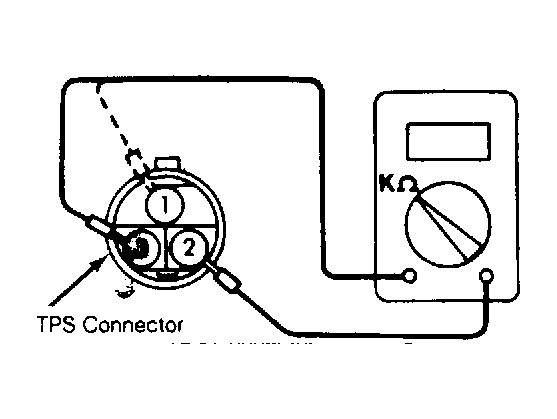 1. Turn ignition switch to "OFF" position. Disconnect Throttle Position Sensor (TPS) connector. Check resistance across terminals No. 1 and 3. See Fig 1 . Resistance should be 3500-6500 ohms.