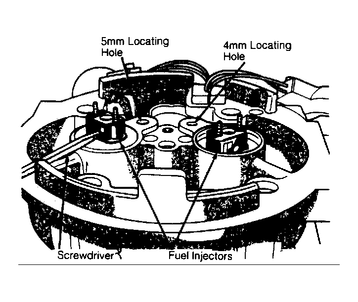- Lightly lubricate upper and lower "O" rings with petroleum jelly. Place injector and cap in injector pod and align cap locating pin with locating hole in casting. See Figure.CAUTION: Passenger side cap locating pin is 5 mm in diameter and will only fit in passenger side locating hole. Driver's side locating pin is 4 mm in diameter.