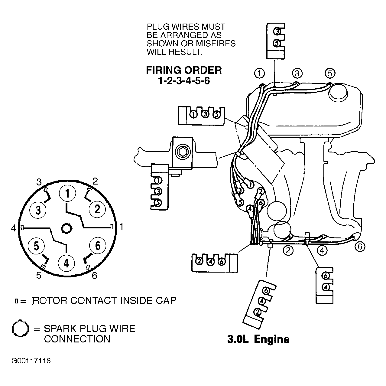 WARNING: On the 3.0L V6, the firing order and the spark plug connection order on the top of the distributor do not match. Circuits internal to the distributor cap differ from the external spark plug wire connections. This is intentional and is done to avoid spark plug wires crossover. See Figure.