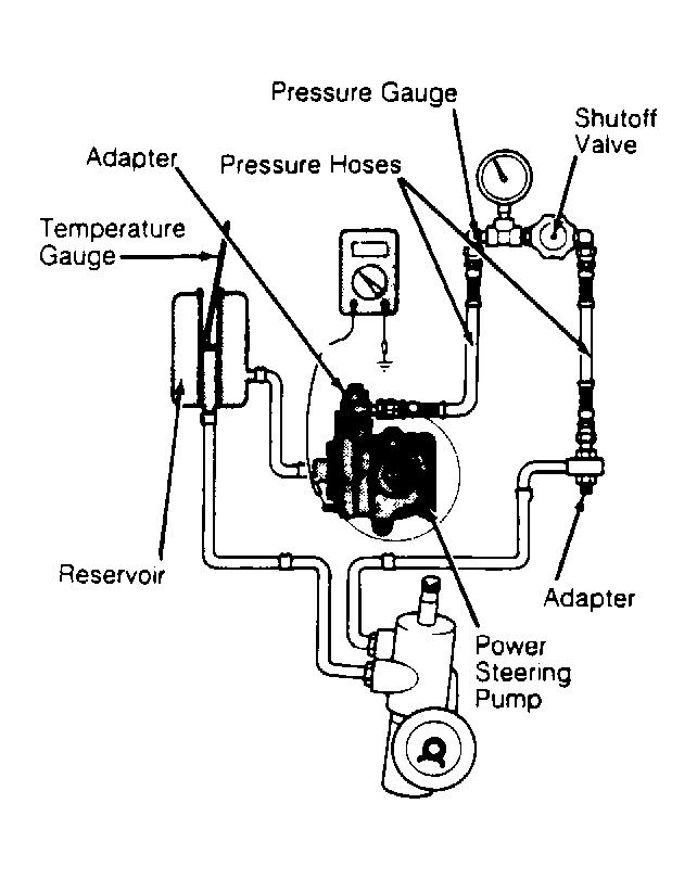 - Disconnect pressure hose from power steering pump. Connect, in line, a pressure gauge and hoses capable of handling 300 psi (21 kg/cm2