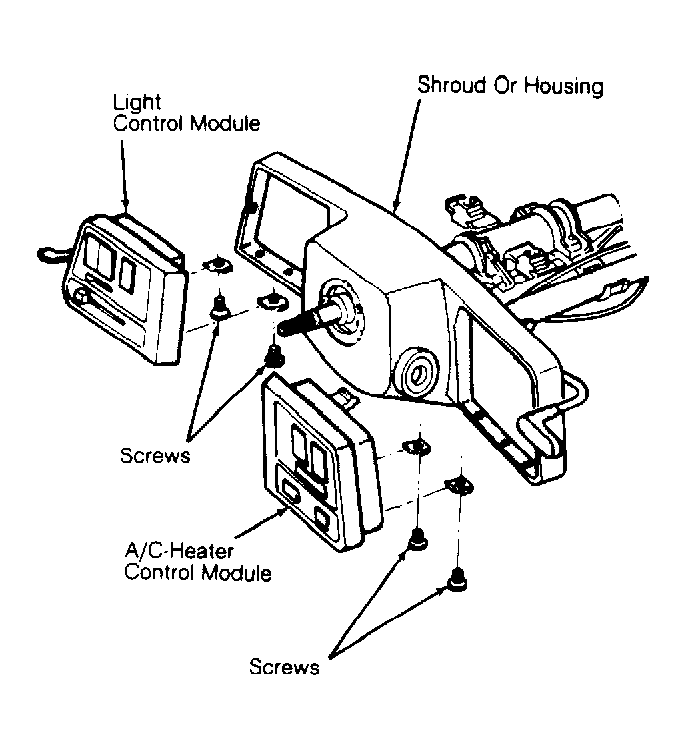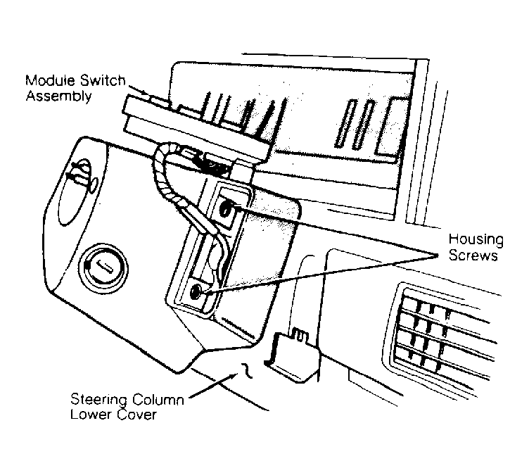 5. Remove lower screw from switch control module housing. Remove switch control module housing from steering column assembly. Remove wire ties retaining both switch harnesses and park interlock cable to steering column. Remove switch control module assemblies from column. To install, reverse removal procedure.