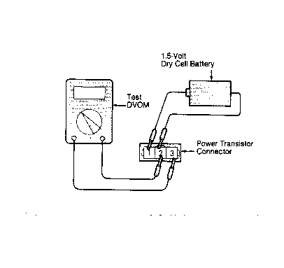 1. Disconnect power transistor connector. Using a 1.5-volt dry cell battery, connect negative end of 1.5-volt battery to terminal No. 2 of power transistor and positive end of 1.5-volt battery to power transistor terminal No. 1. See Fig 1 .