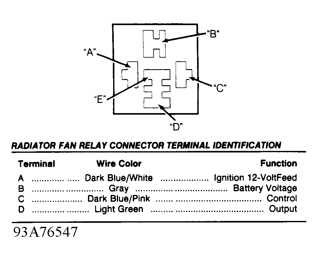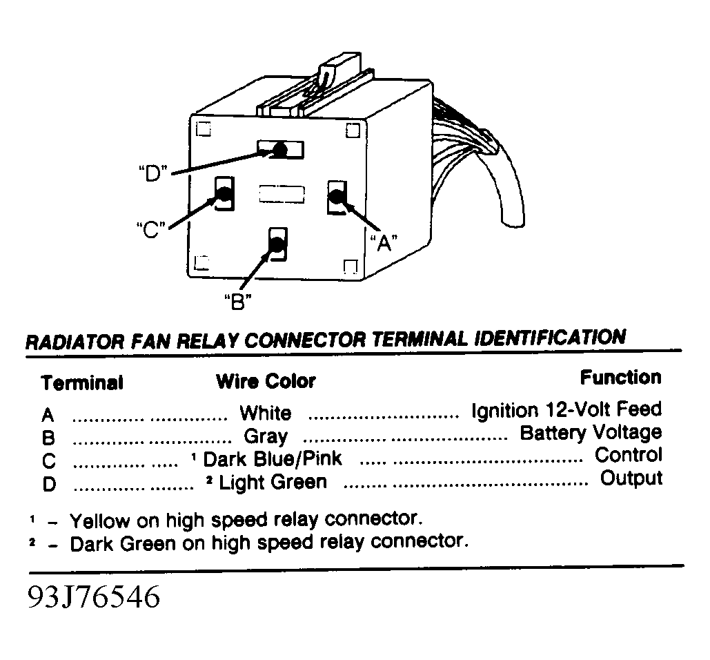Courtesy of CHRYSLER CORP. RADIATOR FAN RELAY CONNECTOR TERMINAL IDENTIFICATION (AS BODY)