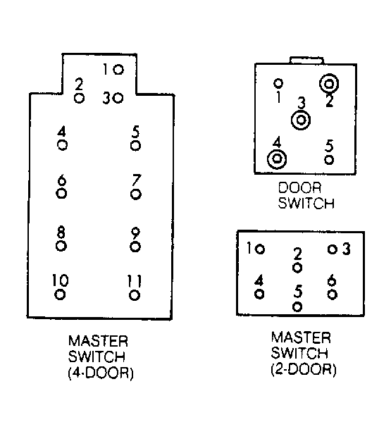 1. Remove control switch from trim panel. Using ohmmeter, check continuity of switch. See appropriate MASTER WINDOW SWITCH CONTINUITY CHART or DOOR SWITCH CONTINUITY CHART and Fig 1 and Fig 2 . Refer to MODEL IDENTIFICATION  for body classification. Replace appropriate switch as necessary if switch continuity is not as specified.
