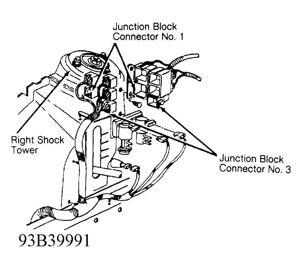- Turn ignition off. Disconnect junction block connectors No. 1 and 3. Junction block is located next to right shock tower. See Fig 1. Using an external ohmmeter, check resistance between junction block connector No. 1 (junction block side) at injector driver No. 1 wire (White/Dark Blue wire) and junction block connector No. 3 (junction block side) at Auto Shutdown (ASD) relay output wire (Dark Green/Orange wire).