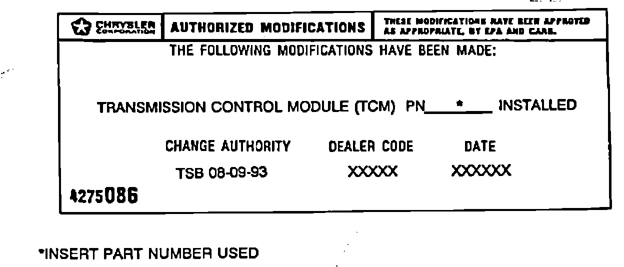 THE FOLLOWING REPAIR APPLIES TO 1993 VEHICLES EQUIPPED WITH A 41TE OR 42LE FOUR SPEED AUTOMATIC TRANSAXLE AND EATX II TCM IDENTIFIED IN THE PARTS REQUIRED SECTION.