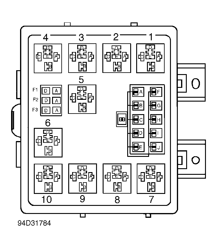1. Remove ON/OFF (intermittent) wiper relay (relay No. 6) and HI/LO wiper relay (relay No.10) from Power Distribution Center (PDC). See Figure . PDC is located on left front fender apron. Using scan tool in ohmmeter mode, measure resistance at terminal "D" (Red/Dark Blue wire) on intermittent wiper relay socket. If resistance is less than 5 ohms, repair short to ground in Red/Dark Blue wire and replace fuse "E". If resistance is 5 ohms or greater, go to next step.