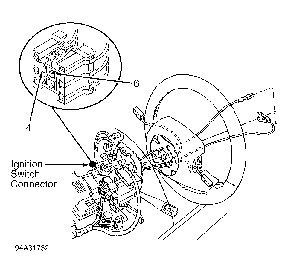 1. Disconnect ignition switch connector. See Figure . Ensure connector is clean and undamaged. Using scan tool in ohmmeter mode, measure resistance at terminal No. 4 (Black wire) on ignition switch connector. If resistance is 5 ohms or greater, repair open Black wire. If resistance is less than 5 ohms, go to next step.