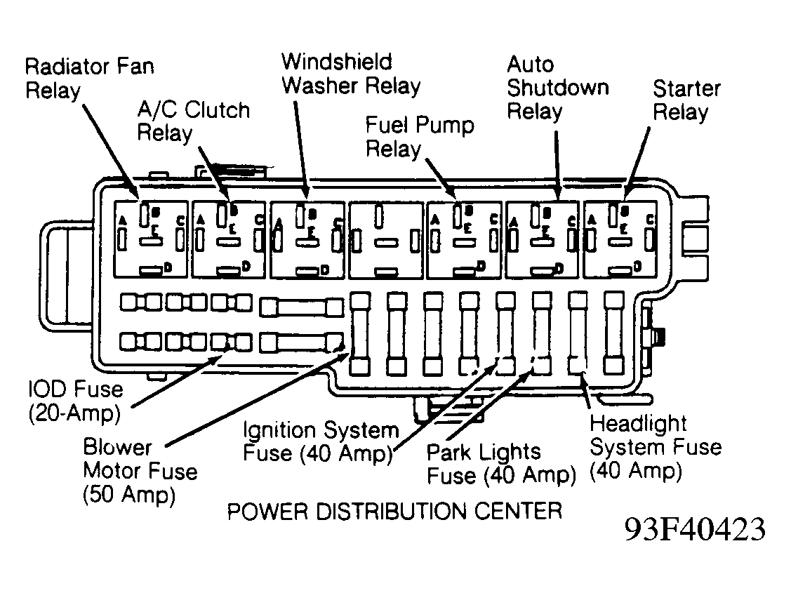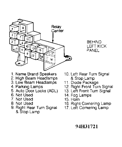 6. Gain access to relay center, located under dash, attached to left kick panel. See Figure . Remove Auto Door Lock (ADL) relay. Put DRB in ohmmeter mode. Measure resistance at ADL relay connector terminal "E" (Black wire). If resistance is more than 5 ohms, repair open Black wire. If resistance is less than 5 ohms, go to next step.