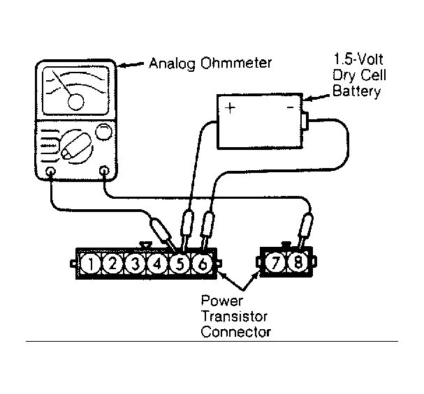 - Connect ohmmeter leads between power transistor terminals No. 5 and 8. See Fig 1 . Using a 1.5-volt dry cell battery, connect positive battery lead to power transistor terminal No. 5 and negative lead to terminal No. 6.