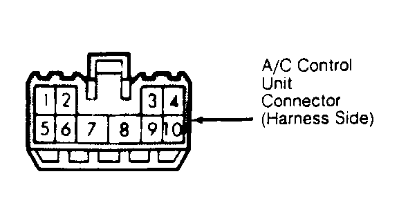 - Using a voltmeter, measure voltage between terminals No. 2 and 3 on wire side of A/C control unit connector. With A/C switch in the on position, voltmeter should read approximately 12 volts. Turn A/C switch to off position. Measure voltage between terminals No. 2 and 8. Voltmeter should read zero volts.