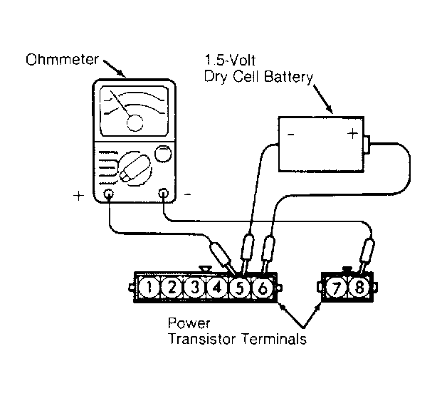 1. Connect analog ohmmeter leads between power transistor terminals No. 5 and 8. See Fig 1 . Ensure ohmmeter negative lead is connected to terminal No. 8. Ohmmeter should indicate no continuity.