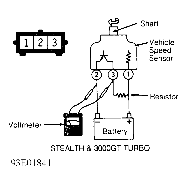 - VSS is located at end of speedometer cable in transmission. Remove VSS. Connect battery, resistor (3-10 ohms) and voltmeter to indicated terminals. See Fig 1 or Fig 2 . Ensure voltage pulses 4 times per speedometer shaft revolution. If voltage is not as specified, replace VSS. If voltage is as specified, go to next step.