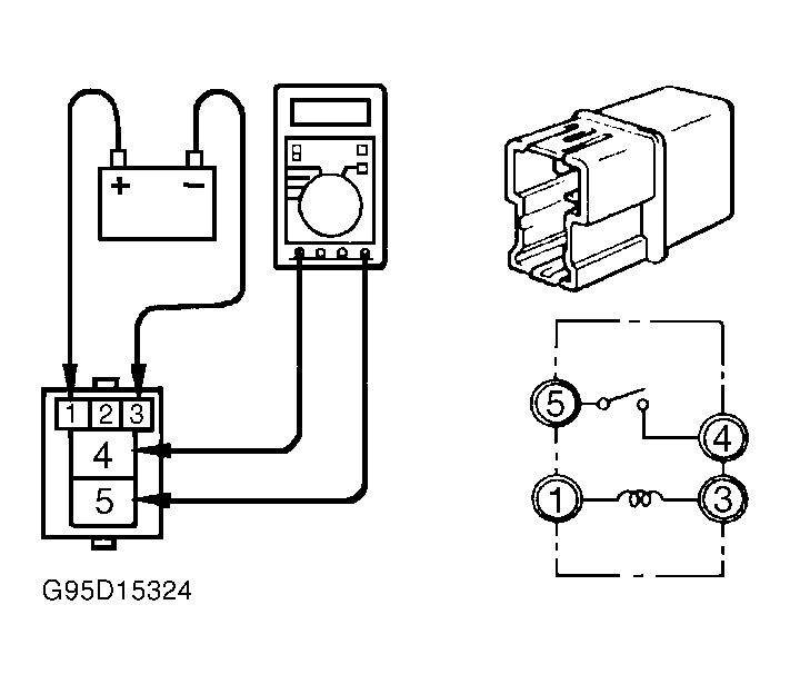 . Continuity should be present between terminals No. 4 and No. 5 with voltage applied. Replace power window relay if continuity is not as specified.