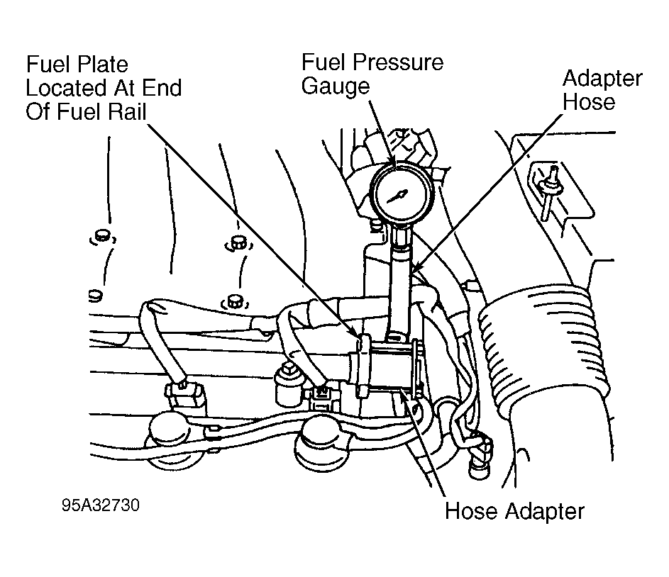 - Remove bolts and fuel plate from end of fuel rail. Fuel plate is located on driver's side of front (radiator side) fuel rail. See Fig 1 . Fuel plate is near the air intake hose.