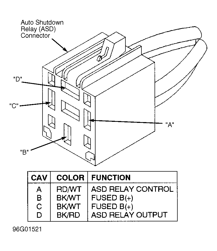 - Turn ignition off. Disconnect Powertrain Control Module (PCM) connector. Using scan tool in ohmmeter mode, check resistance of ASD relay control circuit at ASD relay connector. See Fig 1 and the ASD RELAY CONNECTOR WIRE IDENTIFICATION table for wire identification. If resistance is 5 ohms or more, go to next step. If resistance is less than 5 ohms, repair short to ground in ASD relay control circuit. Perform TEST VER-2A.