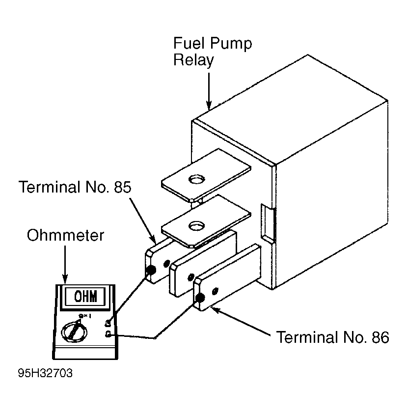 - Using external ohmmeter, check resistance between terminals No. 85 and 86 on fuel pump relay. See Fig 2 .