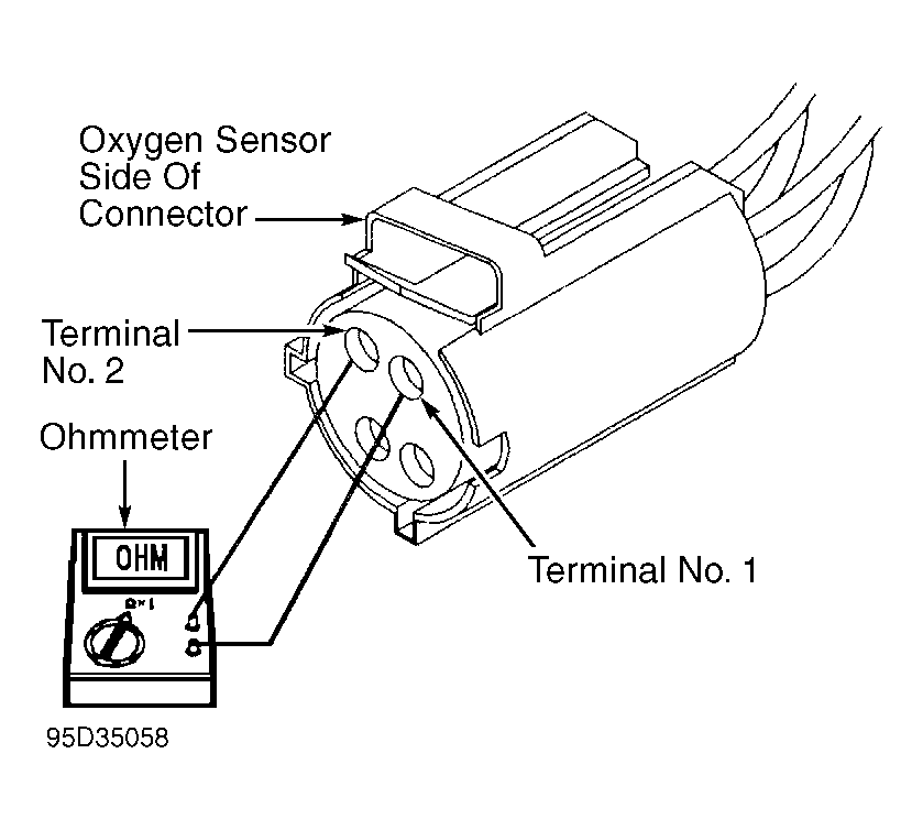 - Stop downstream oxygen sensor heater test. Using external ohmmeter, check resistance of downstream oxygen sensor heater between terminals No. 1 and 2 on oxygen sensor side of connector for downstream oxygen sensor. See Figure for terminal identification.