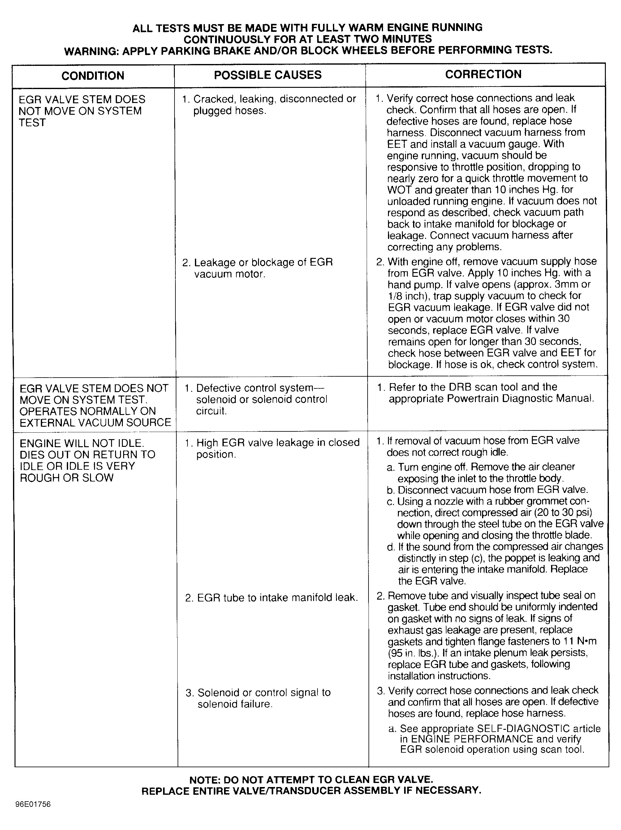 - Ensure engine coolant temperature is more than 150°F (66°C). Put transmission in Neutral. Allow engine to idle for approximately 70 seconds. Suddenly accelerate engine to approximately 2000 RPM, but not more than 3000 RPM. EGR valve stem should move when accelerating engine. Repeat test several times to confirm EGR valve stem movement. If EGR valve stem moves, EGR control system if functioning properly, go to next step. If EGR valve stem does not move, See Figure ., EGR DIAGNOSTIC CHART.