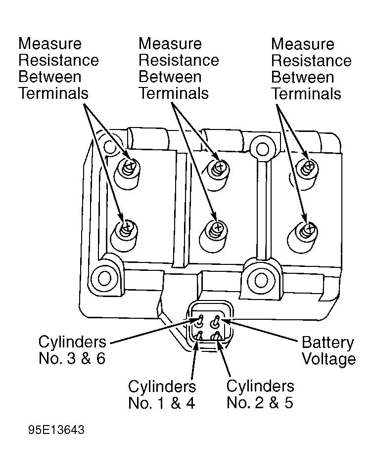 - Turn ignition off. Disconnect ignition coil electrical connections. Using a DVOM, measure resistance of primary and secondary coil circuits. Measure primary circuit resistance between battery terminal and terminal for cylinders being checked. See Fig 1 .
