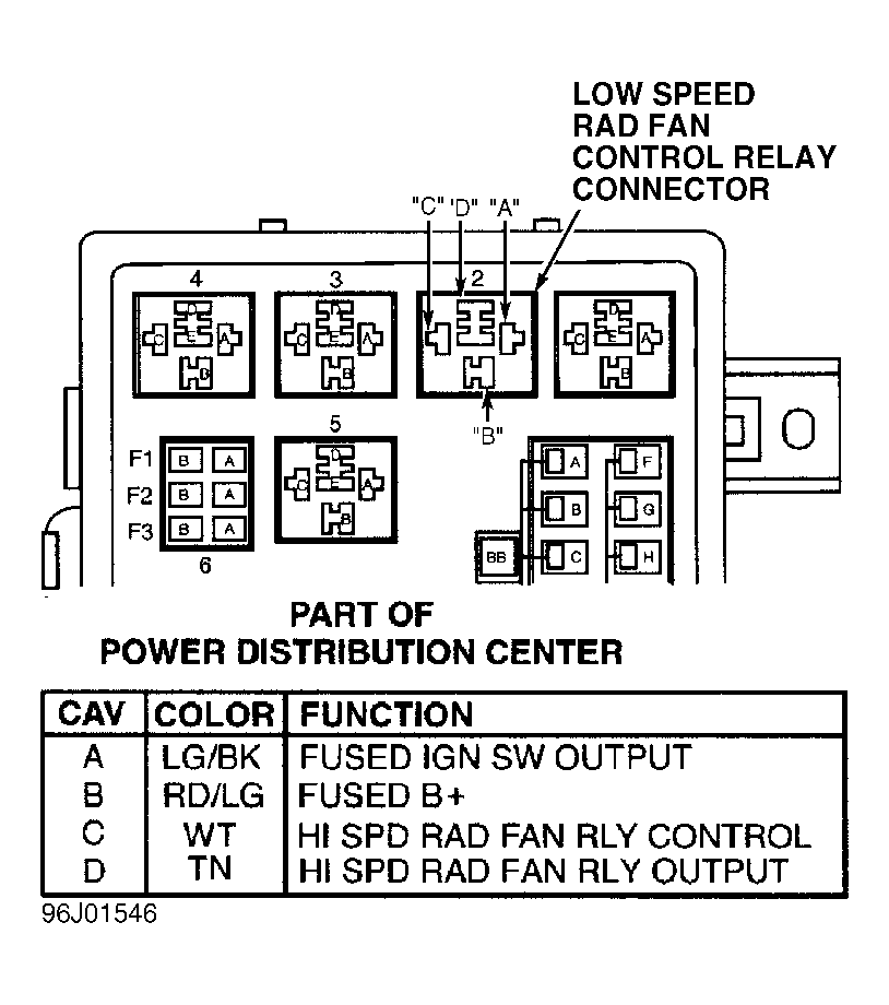 - With actuator test still running, wiggle wiring harness between low speed fan relay and PCM. Low speed fan relay is located in Power Distribution Center (PDC). If wiggling caused an interruption in low speed fan relay clicking, repair wiring harness as necessary where wiggling caused problem to appear. Perform TEST VER-2A . If wiggling did not cause an interruption in low speed fan relay clicking, see INACTIVE TROUBLE CODE CONDITION . Test is complete. Perform TEST VER-2A .