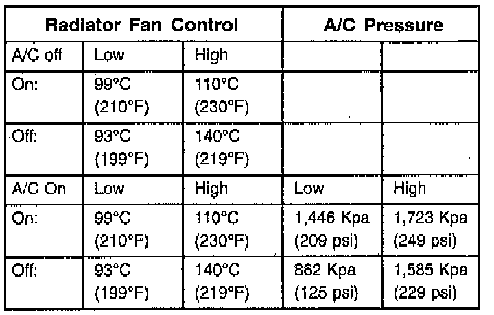 Fan control is accomplished two ways. A pressure transducer on the air conditioning compressor discharge line sends a signal to the Powertrain Control Module (PCM) which will activate both fans if necessary. In addition to this control, the fan is turned on based on coolant temperature sensor output to the PCM. The PCM switches the fans on through the fan relays. Switching through the PCM provides fan control for the following conditions.